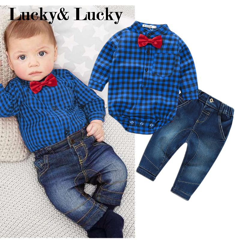 New blue plaid rompers shirts with red bow+jeans baby boys clothes bebe clothing set