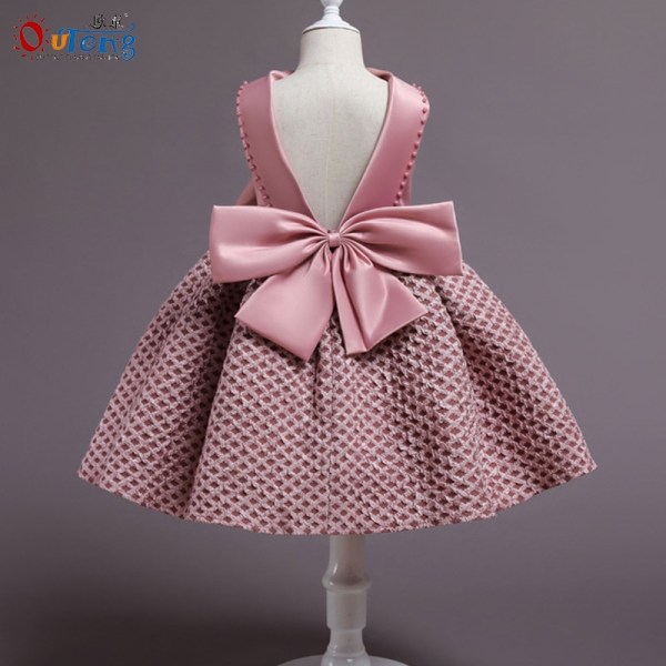 Outong Lattice Design Children Summer Dresses Double Layered Collar V Back Cute Bow Pearls Girls Child Girl Princess Dress