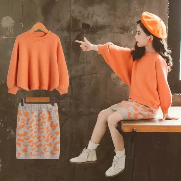 Kids Knitted Suits for Girl Loose Bat Sweater + Leopard Skirt 2piece Set Children Cute Outfits Teen Clothing Spring Autumn